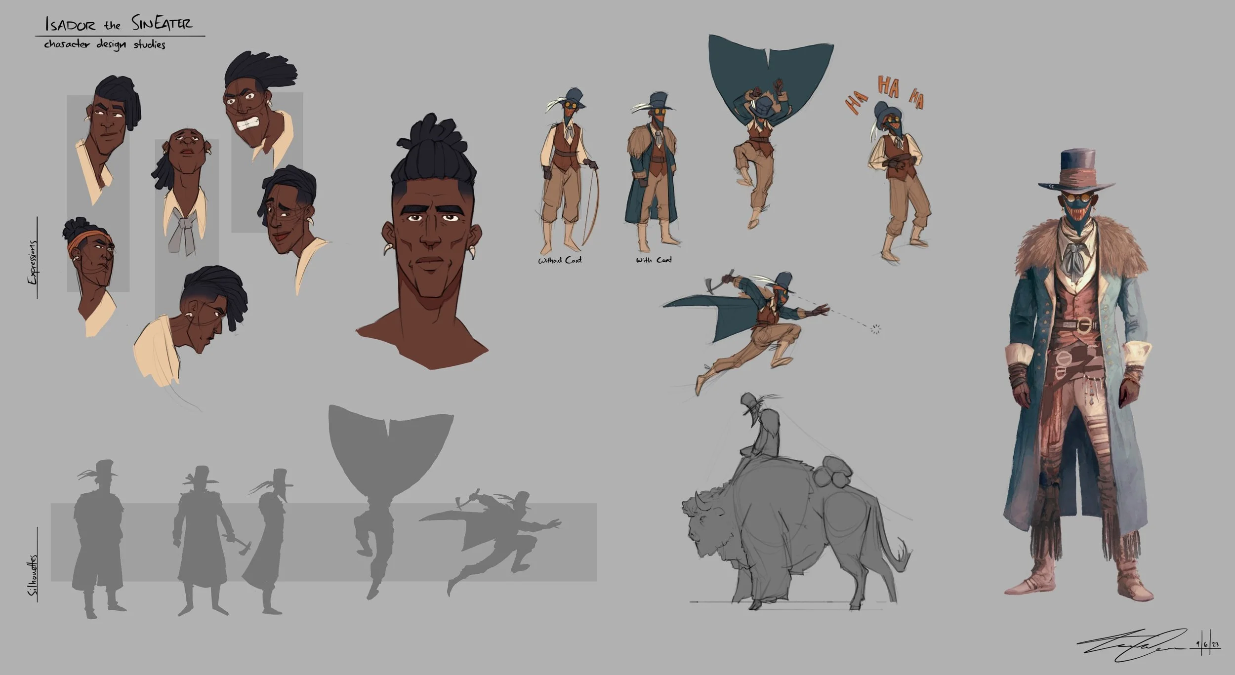 The world of the Sin Eaters is built around mythic motifs of the post-apocalyptic western, magical realism, and gothic literature. Much of the design language and narrative arcs have been informed by my time in the American Southwest and my love of popular culture, history, and esotericism. The work in this project is primarily focused on Isidore’s character design, a wondering bounty hunter contracted to fight the dark spirits of this scared and ancient land.